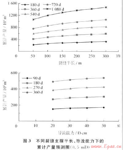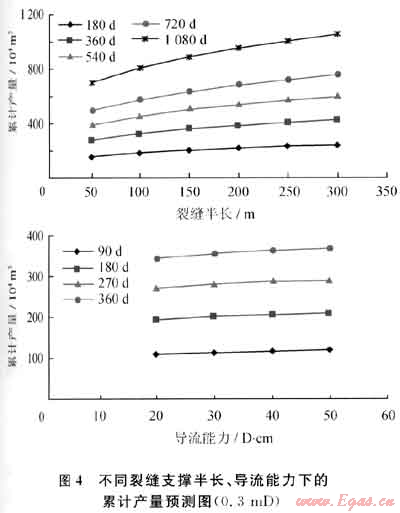 根據(jù)鄰井各氣層解釋結(jié)果,其有效滲透率主要分布于0.3~0.5mD,通過(guò)FracproPT軟件模擬,確定不同滲透率對(duì)應(yīng)的裂縫參數(shù):最優(yōu)裂縫長(zhǎng)度為150~200m,最優(yōu)裂縫導(dǎo)流能力為30D·cm(圖3、4)。