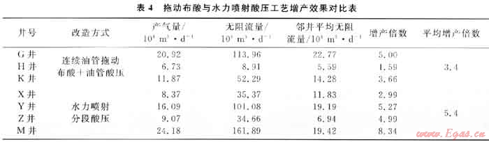 2010年采用連續(xù)油管拖動(dòng)布酸+油管酸壓改造施工水平井3口,平均無(wú)阻流量是鄰井直井的3.4倍;而采用水力噴射分段酸壓改造施工水平井4口,平均無(wú)阻流量是鄰井直井的5.4倍,改造效果突出,其中2口井獲得日產(chǎn)百萬(wàn)立方米的無(wú)阻流量(表4)。