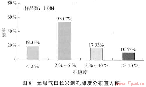 對普光氣田26口井與元壩氣田10口井巖心物性分析樣品統(tǒng)計(jì)的結(jié)果發(fā)現(xiàn),兩地區(qū)飛仙關(guān)組儲層物性差別明顯[5]。長興組儲層孔隙度、滲透率具有一定的可比性,孔隙度最大值分別為27.9%、24.65%,主要介于2%~5%(圖6),孔隙度介于5%~10%的樣品數(shù)普光氣田略高于元壩氣田,滲透率兩地區(qū)都集中分布在介于0.02~0.25mD與大于1mD區(qū)間。