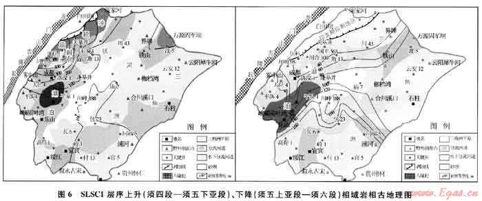SLSC2層序基準(zhǔn)面下降期對應(yīng)須五上亞段及須六段沉積期,該時期屬于龍門山活動相對寧靜期,古地形相對變緩,沉積體系演變?yōu)橐匀侵?淺湖沉積為主,須五段早期的辮狀河三角洲向曲流河三角洲演變,湖盆中心位于彭山-射洪一線,呈北東向展布,明顯受古龍門山控制。三角洲前端淺湖砂壩及河口壩較湖盆擴(kuò)張期規(guī)模亦明顯變小,主要由龍門山前緣川西坳陷北段安縣-中壩地區(qū),米倉山-大巴山前萬源-宣漢、川東南川-重慶、川南宜賓-威遠(yuǎn)地區(qū)提供物源并發(fā)育規(guī)模相對較小的三角洲沉積。受晚印支運(yùn)動影響,盆地北部安縣-劍閣一帶須五段沉積后隆升剝蝕缺失,須六段無沉積。