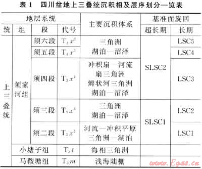 四川盆地須家河組2個超長期旋回分別對應(yīng)于須家河早期(以安縣運(yùn)動侵蝕面為界[3],沉積T3x2-T3x3,俗稱須下盆)和須家河晚期(沉積T3x4-T3x6,俗稱須上盆)2個成盆期構(gòu)造層序。長期基準(zhǔn)面旋回與vail經(jīng)典層序理論中的Ⅲ級層序相當(dāng),是一套具較大水深變化幅度的、彼此間具成因聯(lián)系的地層所組成的區(qū)域性湖進(jìn)湖退沉積序列,可稱為沉積層序,5個長期旋回層序宏觀上對應(yīng)于須二、須三、須四、須五、須六段。