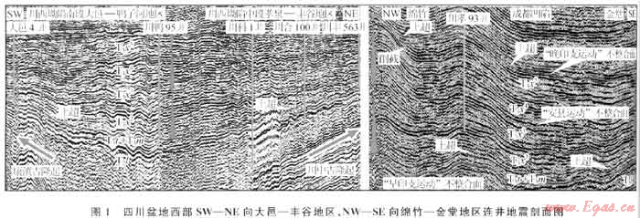 受資料限制,多數(shù)學(xué)者沉積相分析主要來自于地表露頭及鉆井資料,地震層序分析是獲得本文不同于前期地質(zhì)認(rèn)識的重要依據(jù),主要線索包括地震剖面上地層厚度變化關(guān)系、層間接觸關(guān)系,層段內(nèi)砂體或砂層組分布及疊加樣式等。主要選取了與龍門山或川西坳陷平行、垂直的NE向和NW 向區(qū)域二三維地震剖面進(jìn)行層序格架與砂體疊加樣式分析。