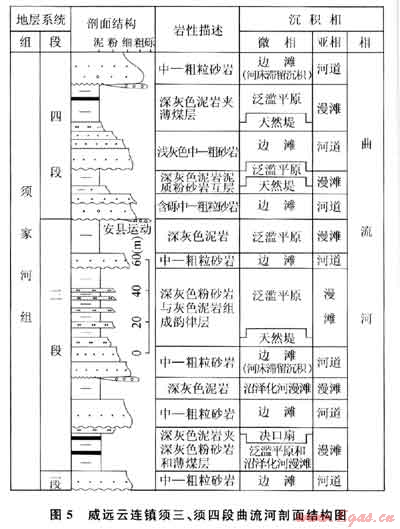 河流沉積體系主要分布于川中前陸隆起帶近物源的中、南部的須二-須六段,平面分布受南高北低的古地形控制,辮狀河和曲流河都有發(fā)育,以前者為主,但以后者更典型。