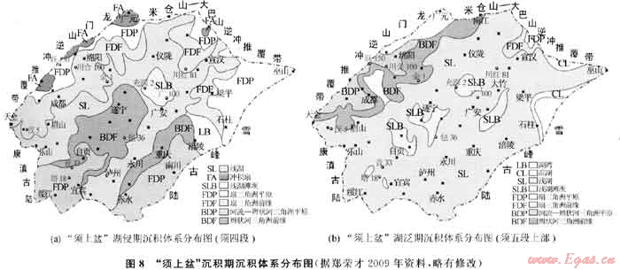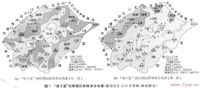2) 受“安縣運(yùn)動(dòng)”影響[22],沿造山帶前緣普遍發(fā)育有大規(guī)模的沖積扇-扇三角洲沉積體系,而川中前陸隆起帶和川東南坳陷帶仍為河流-辮狀河三角洲沉積體系的繼承性發(fā)育區(qū),圍繞前陸隆起帶的3個(gè)前緣坳陷中心區(qū)依然以發(fā)育湖泊沉積體系為主,從總體上看,“須上盆”繼承了“須下盆”構(gòu)造-沉積格局的基本特征。