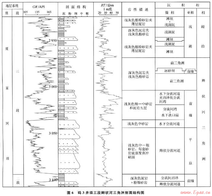無論是辮狀河還是曲流河三角洲,都可劃分為三角洲平原、三角洲前緣和前三角洲3個(gè)亞相。以廣為發(fā)育的辮狀河三角洲為例(圖6):