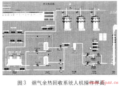 導熱油循環(huán)泵采用軟啟器啟動,手動/自動切換及導熱油循環(huán)泵切換均由上位機控制,當發(fā)生故障時有故障報警燈報警。變頻高溫引風機采用變頻/工頻手動切換、手動/自動切換控制、故障報警。電加熱煅燒爐電動煙氣閘板由上位機控制,現(xiàn)場設開閉控制器。煙氣余熱回收系統(tǒng)人機操作界面見圖3,煙氣余熱回收系統(tǒng)中所有溫度、壓力、流量、液位顯示及故障報警均在上位機人機操作界面中顯示。