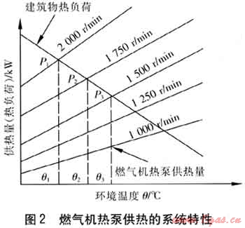 燃氣機熱泵供熱的系統(tǒng)特性見圖2,顯示了燃氣機在不同轉(zhuǎn)速時,熱泵能提供的供熱量與建筑物在不同環(huán)境溫度下所需熱負荷之間的關(guān)系。假設在滿足建筑物最大熱負荷(即壓縮機最大負荷,P1點)條件下確定傳動比,此時燃氣機具有最好的經(jīng)濟性,即燃氣機工作在經(jīng)濟轉(zhuǎn)速區(qū)間內(nèi),熱泵的其他工作狀態(tài)點(P2,P3等點)也都唯一確定。而實際E燃氣機熱泵大部分時間都處于部分負荷運行狀態(tài),最大負荷運行時間不超過總運行時間的10%。因此當機組處于部分負荷運行狀態(tài)時,以最大負荷工況確定的傳動比將使燃氣機低效率運行,燃料消耗量大,全年運行經(jīng)濟性差。因此單級傳動比是以犧牲燃氣機的經(jīng)濟性為代價來滿足壓縮機的動力性要求,且當建筑物熱負荷變化范圍較大時,燃氣機在低速、低負荷狀態(tài)下工作時,可能會出現(xiàn)燃氣機效率過低的問題。因此,這種方案并不理想。