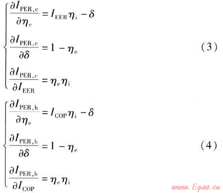由式(1)、(2)可知,燃氣機熱泵的一次能源利用率與熱泵的性能系數(shù)、燃氣機的熱效率及余熱回收系數(shù)有關(guān),各因素對PER的影響程度不同。IPER,c、IPER,h分別對ηe、IEER或ICOP求偏導,得: