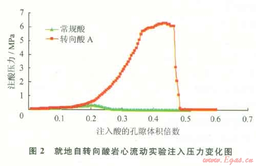 巖心實驗結(jié)果表明:就地自轉(zhuǎn)向酸注入壓力先隨注入體積的增大而增大,當(dāng)注入一定量時,注入壓力急劇升高,最大增加到6.3MPa,是初始注酸壓力0.1MPa的近60倍;自轉(zhuǎn)向的注入壓力是常規(guī)酸注入壓力的20倍左右,自轉(zhuǎn)向酸具有明顯的轉(zhuǎn)向性能(圖2)。
