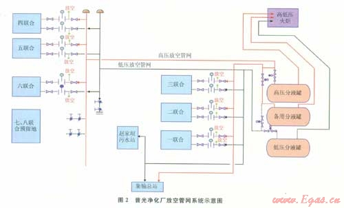 放空管網系統(tǒng)包括從各系列天然氣凈化裝置內的放空閥后至高低壓放空分液罐的部分。每系列裝置管廊上的高低壓放空總管經位于裝置界區(qū)的高低壓分液罐分離泄放氣中攜帶的脫硫、脫水溶劑后,匯入東西區(qū)高低壓放空管網。東區(qū)高低壓放空管網主要負責第一、二、三聯(lián)合天然氣凈化裝置、趙家壩污水站及集氣總站的放空需要,西區(qū)高低壓火炬放空管網主要負責第四、五、六聯(lián)合天然氣凈化裝置的放空需要。東西區(qū)高壓放空管網并行進入高壓放空分液系統(tǒng),東西區(qū)低壓放空管網匯合成低壓放空總管后進入低壓放空分液系統(tǒng)。