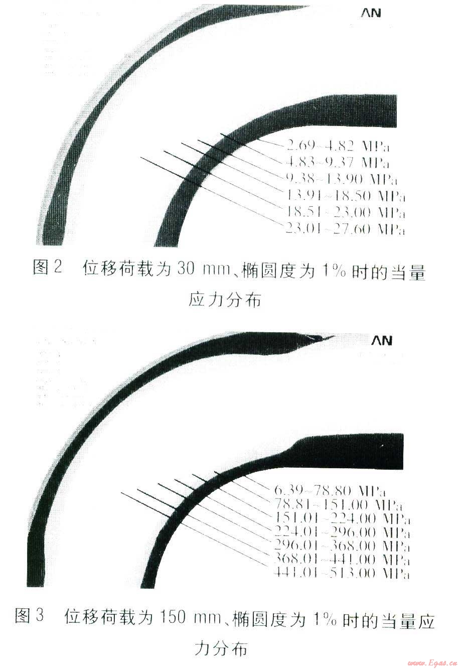 最高循環(huán)溫度為130℃,安裝溫度為l0℃,彎管內(nèi)表面施加l.6 MPa的壓力荷載。在對(duì)直臂施加不同位移荷載,以及不同橢圓度下對(duì)彎頭的當(dāng)量應(yīng)力分布進(jìn)行模擬。直臂分別施加l0、30、50、80、150、200 mm的位移荷載,橢圓度變化范圍為l%~20%。位移荷載分別為30、150mm、橢圓度為1%時(shí)的當(dāng)量應(yīng)力分布見圖2、3,各個(gè)色塊的當(dāng)量應(yīng)力范圍標(biāo)注在圖中。由圖2、3可知,彎頭中線部位當(dāng)量應(yīng)力最大。在對(duì)直臂施加不同位移荷載時(shí),彎頭中線部位當(dāng)量應(yīng)力不同。對(duì)直臂施加的位移荷載越大,彎頭所受當(dāng)量應(yīng)力越大。