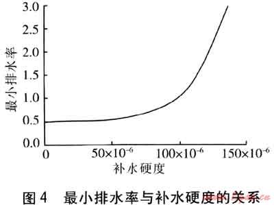 對蒸發(fā)冷卻系統(tǒng)而言,由于水不斷蒸發(fā),溶于水中的礦物質(zhì)會析出并沉積在濕簾表面上形成水垢。濕簾表面大量的水垢會影響濕簾的蒸發(fā)冷卻效率和使用壽命。目前,在燃?xì)廨啓C(jī)進(jìn)氣冷卻系統(tǒng)中,一般針對不同的補(bǔ)水硬度(以CaC03計,質(zhì)量分?jǐn)?shù))通過控制排水率(即排水質(zhì)量與蒸發(fā)水質(zhì)量之比)的方法來抑制水垢的產(chǎn)生。最小排水率通常采用圖4的曲線來確定[3]。