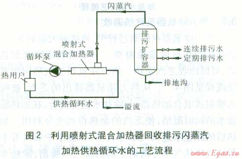 利用噴射式混合加熱器回收排污閃蒸汽,加熱供熱循環(huán)水,工藝流程見圖2。鍋爐的排污水進人排污擴容器后,由于壓力降低,產(chǎn)生閃蒸汽,將閃蒸汽引入噴射式混合加熱器,加熱供熱循環(huán)水。