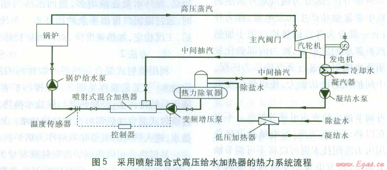 采用噴射混合式高壓給水加熱器替代傳統(tǒng)的高壓加熱器,可以從根本上解決這一問題。噴射混合式高壓給水加熱器即在噴射式混合加熱器前增設一臺變頻增壓泵(見圖5)。由于汽水直接混合,因此噴射混合式高壓給水加熱器換熱效率較高。由于不存在結構復雜的高壓加熱器疏水系統(tǒng),運行可靠性得到大幅提高。