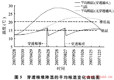 第二種方法是先將污氮采用噴霧加濕,溫度從10℃降至5.3℃,相對濕度增至29%,然后將此低溫污氮氣體進行糧堆穿透通風,平均糧溫變化曲線如圖5所示。由圖可知,無穿透降溫時倉內(nèi)平均糧溫在8月份已經(jīng)超過20℃的準低溫標準。為了實現(xiàn)低溫儲糧,當平均糧溫超過15℃時,采取污氮穿透糧堆的通風方式進行降溫,將糧食冷卻到12℃;隨著外界環(huán)境對糧溫的影響,冷卻后的糧溫會繼續(xù)升高,當平均糧溫升高到15℃時,繼續(xù)采用穿透糧堆通風的方式進行降溫,從而實現(xiàn)全年的低溫儲糧。