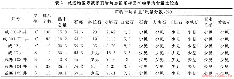 但比較四川盆地寒武系和志留系頁巖,筆者認(rèn)為,四川盆地頁巖氣勘探開發(fā)的首選目標(biāo)應(yīng)為川南志留系,理由如下:①盡管寒武系和志留系烴源巖都有較高的有機碳豐度和較好的有機質(zhì)類型,但志留系烴源巖的成熟度略低于寒武系。②運聚條件不同,志留系烴源巖在川南地區(qū)生烴強度大于川東地區(qū),但在川東地區(qū),石炭系直接覆蓋在志留系之上,由于石炭系有較好的滲儲條件,所以形成大中型氣田[5],而川南地區(qū)雖處生烴凹陷,但由于石炭系缺失,所以二疊系直接覆蓋在志留系之上,而二疊系孔隙不發(fā)育,滲儲空間主要為裂縫。已有的研究表明,二疊系甚至三疊系嘉陵江組都有天然氣來自志留系,但沒有形成向石炭系那樣的大氣田。顯然川南地區(qū)志留系排烴程度沒有川東地區(qū)高,換句話說,滯留在川南志留系中的天然氣應(yīng)當(dāng)較多。據(jù)不完全統(tǒng)計,川南地區(qū)鉆遇志留系有氣顯示的井有8口,也說明這一現(xiàn)象。寒武系生烴條件最好的地區(qū)是川西南地區(qū),而它受樂山龍女寺古隆起的影響較大,具備向震旦系輸氣的條件,也就是說它自身滯留天然氣的條件不如川南志留系。③礦物成分不同。從表2可見,威遠(yuǎn)地區(qū)寒武系頁巖的石英含量與志留系差不多,但黏土含量低于志留系的頁巖,而黏土與吸附氣的多少有關(guān),石英則與造縫能力相關(guān)。