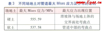 計(jì)算兩種情況下管道的最大應(yīng)力及其位置(見(jiàn)表3),當(dāng)場(chǎng)地土較硬時(shí)最大應(yīng)力出現(xiàn)在滑坡體與場(chǎng)地土體交界處,即在A點(diǎn)和B點(diǎn)的彎曲作用明顯;而當(dāng)場(chǎng)地土較軟時(shí)管道最大Mises應(yīng)力稍小一些,且最大應(yīng)力出現(xiàn)在管道的中部,即較軟的場(chǎng)地土可以使管道產(chǎn)生更大范圍的橫向位移,一定程度上緩解了彎曲應(yīng)力,反而使其最大Mises應(yīng)力有所降低。