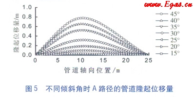 不同滑坡傾斜角時(shí)管道隆起位移量見(jiàn)圖5。管道的隆起位移量隨著傾斜角的增大而增加,但最大隆起位移量始終位于管道中下部,這與管道下方所受土體壓力較大有關(guān)。
