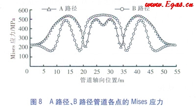 繪制出A路徑和B路徑上管道的Mises應(yīng)力分布曲線(見(jiàn)圖8),拉壓應(yīng)力和彎曲應(yīng)力的組合使得管道部分彎曲區(qū)域形成最小應(yīng)力區(qū)。