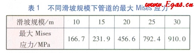 將滑坡傾斜角固定為30°,滑坡規(guī)模分別為10m、15m、20m、25m和30m,得出管道上最大Mises應(yīng)力值如表1所示,隨著滑坡規(guī)模的擴(kuò)大,管道上的最大Mises應(yīng)力迅速增大。