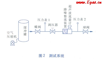 試驗(yàn)中,用來(lái)產(chǎn)生超聲波噪聲的設(shè)備是調(diào)壓器。在氣體流動(dòng)的過(guò)程中,調(diào)壓器兩側(cè)的壓力差越大所產(chǎn)生的超聲波噪聲越大。本測(cè)試的方法是:在一個(gè)容積為5m3的緩沖罐中充入空氣,使其內(nèi)部達(dá)到500kPa左右的絕對(duì)壓力,緩沖罐的一側(cè)接有DN 50mm的管道,管道上依次接有蝶閥、壓力表1、調(diào)壓器、降噪整流裝置、AS超聲波流量計(jì)、壓力表2和球閥。為了模擬實(shí)際使用現(xiàn)場(chǎng),特約束了它們之間的距離。蝶閥與壓力表1相距10D(D為管道公稱直徑),壓力表1與調(diào)壓器相距15D,調(diào)壓器與降噪整流裝置相距5D,降噪整流裝置與AS超聲波流量計(jì)直接連接,超聲波流量計(jì)與壓力表2相距10D,壓力表2與球閥相距10D,測(cè)試系統(tǒng)見(jiàn)圖2。選用的AS超聲波流量計(jì)規(guī)格為DN 50mm,始動(dòng)流量為0.37m3/h,流量范圍為3~150m3/h。