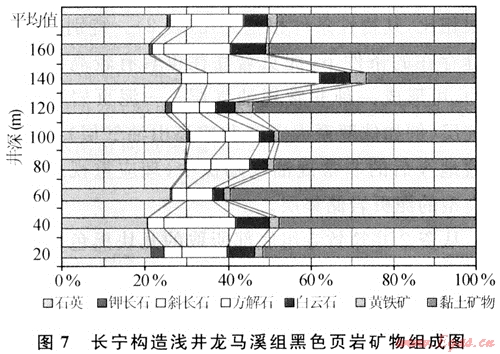 實際上,廣義的頁巖氣還應該包括儲存在黑色頁巖所夾的薄層泥質粉砂巖和各種砂巖中的天然氣。這些泥質粉砂巖和砂巖相對純頁巖而言有較多的孔隙,因此儲存于其中的天然氣多為游離氣,可隨頁巖中的吸附氣一并采出。四川盆地這兩套黑色頁巖普遍含砂質,淺色石英粉砂微細紋層與暗色泥質層交互沉積而顯水平紋理,石英分布不均,局部富集而成泥質粉砂巖。此外,頁巖中還微含鈣質,底部多含硅質,黃鐵礦也較豐富,多呈星散狀分布。對長寧構造龍馬溪組黑色頁巖巖心樣品的礦物成分分析結果也表明,石英含量在20%~30%之間,方解石和白云石含量多在10%~25%,高者可達35%,黃鐵礦含量在1%~4%之間(圖7)。由于黑色頁巖砂質和鈣質較重,因此其性較脆、硬,在加砂壓裂中容易產生裂縫,這對于頁巖氣的開采極為有利。