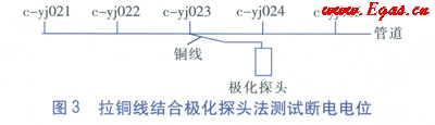 為了得到管道任意位置的陰極保護數(shù)據(jù),包括定向鉆穿越段中間部位、丟失的測試樁、占壓無法打開的測試井等處的陰極保護數(shù)據(jù),擬采用拉銅線和極化探頭相結合的方法進行測試。為了驗證該方法的可靠性及準確性,選取c-yj024測試樁作為管道上任意測試點。步驟為: