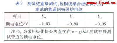 c.在c-yj023測試樁連接銅線,拉銅線到c-yj024測試樁附近,連接c-yj024測試樁附近的極化探頭,測得斷電電位%,極化探頭的埋設位置與在c-yj024測試樁直接測試斷電電位時埋設位置相同(測試方法見圖3),測試數(shù)據(jù)見表3。