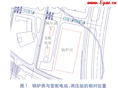 鍋爐房與變配電站、調(diào)壓站的相對(duì)位置見圖1,鍋爐房平面布置見圖2。