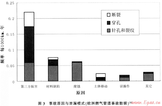 實踐證明,管網(wǎng)長期低壓運行,一旦升高管網(wǎng)運行壓力將增大由于材料缺陷和腐蝕引起天然氣泄漏的機率。但是從歐洲燃氣管道的統(tǒng)計數(shù)據(jù)來看(圖3)。管道自身原因?qū)е碌男孤┩容^輕微(針孔和裂紋)。發(fā)生重大事故的可能性較小。因此,升壓運行帶來的風險并不大,并且完全可以通過采取必要的保護措施加以規(guī)避。