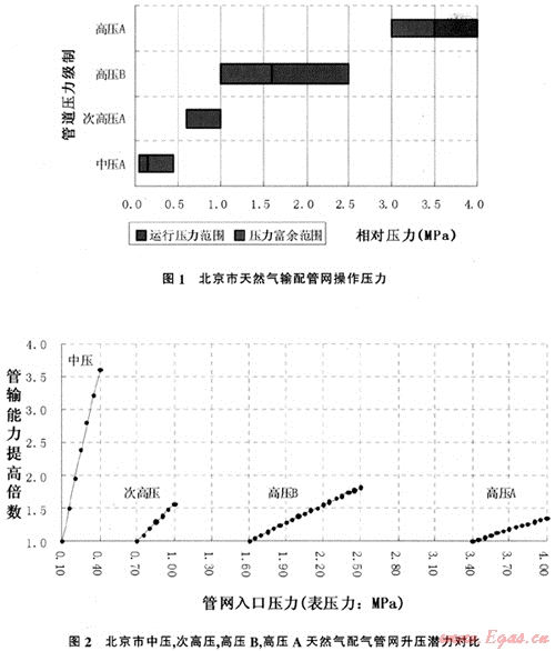 2008年—2009年冬季高峰日輸送氣量為4230萬m3,小時高峰輸送量為210萬m3。自1997年以來,年高峰日輸送量平均增長率超過40%。若實現(xiàn)北京市120億m3天然氣供應(yīng)量目標,據(jù)測算,高峰輸送量為10500萬m3,高峰小時輸送量為580萬m3。在現(xiàn)有管網(wǎng)最大運行壓力下,提高輸送能力的方法。一是增加進氣點既建調(diào)壓站,二是增加管線建設(shè)。北京天然氣高壓以上管線僅占總管線長度的8.6%,合理增建高壓管線是有必要的,也是有條件的。但中壓管線已占總管線長度的40%,中壓天然氣管線幾乎遍布市區(qū)所有主干公路,據(jù)北京天然氣管網(wǎng)規(guī)劃。2020年中壓管網(wǎng)輸送能力將由目前150萬m3增加到255萬m3。單靠增加中壓管線建設(shè)提高管網(wǎng)輸送能力即不經(jīng)濟也不現(xiàn)實。因此,如何提高現(xiàn)有管網(wǎng)的輸送能力,是我們亟待解決的問題。
