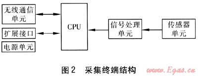采集終端包括傳感器單元、信號處理單元、系統(tǒng)控制(CPU)單元、無線通信單元和電源單元等。采集終端結(jié)構(gòu)見圖2。