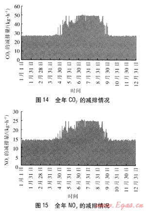 圖14、15為PEMFC建筑熱電聯(lián)供系統(tǒng)全年的C02和N0x的減排情況,涂黑區(qū)域的上邊界線表示系統(tǒng)運行時的污染物減排量,下邊界線表示系統(tǒng)不運行時污染物減排量為0。PEMFC建筑熱電聯(lián)供系統(tǒng)在夏季的減排效果明顯,這是因為夏季有時是2臺電池堆同時運行。模擬計算結果為:PEMFC建筑熱電聯(lián)供系統(tǒng)與基準方案相比,全年可減排C02量為133.2t,減排N0x量為67.1t。