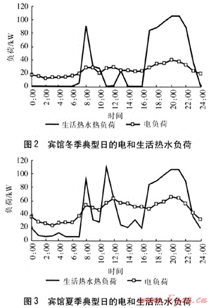 賓館夏季峰值電力負荷為83.9kW,冬季峰值電力負荷為39.8kW,夏季峰值電力負荷約為冬季峰值電力負荷的2倍,且夏季典型日電量也約為冬季典型日電量的2倍;冬季與夏季生活熱水負荷的峰值大致相同,但是夏季典型日的生活熱水熱量約為冬季典型日的1.4倍。