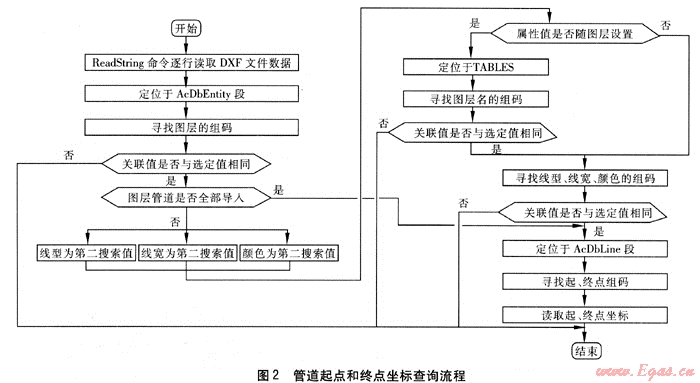 圖2為管道的起點和終點坐標的查詢流程圖。程序首先打開儲存管網(wǎng)信息的DXF文件,調(diào)用VC的ReadString命令逐行讀取管網(wǎng)數(shù)據(jù)。當查詢到儲存線段信息的AcDbEntity段,找到線段的圖層名組碼,如果組碼的關(guān)聯(lián)值與導入管網(wǎng)簡圖命令對話框的選定值相同,接著判斷此圖層中線段是否全部導入,如果全部導入,定位于AcDbEntity段下的AcDbLine子段,讀取線段的起點和終點坐標;如果還需要根據(jù)圖層中線段的屬性信息進一步進行篩選,則首先需要判斷是根據(jù)線段的顏色、線型、線寬3個屬性中哪個屬性進行選擇。例如選擇的是顏色屬性,首先判斷線段的顏色是否隨圖層設(shè)置,如果隨圖層設(shè)置,在TABLES段中,尋找圖層名的組碼,確定組碼的關(guān)聯(lián)值與選定值相同的圖層,接著尋找此圖層名下線段的顏色的組碼,如果組碼的關(guān)聯(lián)值與選定值相同,在AcDbLine段中找到此線段,然后讀取起點和終點坐標;如果線段的顏色不隨圖層設(shè)置,則直接在AcDbLine段中根據(jù)管道顏色找到該線段的起點和終點坐標即可[6~7]。