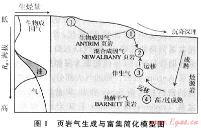 1) 天然氣成因確定是頁(yè)巖氣資源評(píng)價(jià)、勘探目標(biāo)選擇、開發(fā)方案制訂的基礎(chǔ)。盆地斜坡/中心,傾油有機(jī)質(zhì)經(jīng)歷充分熱降解或熱裂解,熱成因頁(yè)巖氣較發(fā)育;有機(jī)質(zhì)成熟度較低、水動(dòng)力條件優(yōu)越的盆地邊緣,生物成因氣發(fā)育。同屬上泥盆統(tǒng)-下密西西比統(tǒng)海相黑色頁(yè)巖,Michigan盆地北部淺層低成熟的Antrim頁(yè)巖氣為生物成因,Appalachian盆地Ohio頁(yè)巖、Fort Worth盆地Barnett頁(yè)巖、Arkama盆地Woodford頁(yè)巖氣為熱解成因,Illinois盆地New Albany頁(yè)巖氣為混合成因氣。