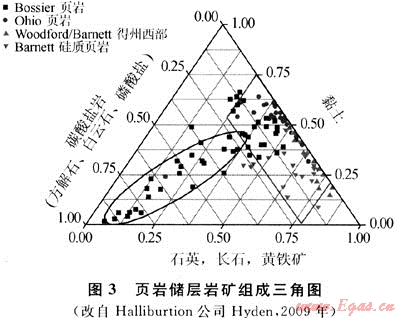 裂縫發(fā)育受內(nèi)、外因控制。外因主要與生烴過程、地層孔隙壓力、各向異性的水平壓力、斷層與褶皺等構(gòu)造作用相關(guān),內(nèi)因主要取決于頁(yè)巖礦物學(xué)特征。圖3展示了已開發(fā)頁(yè)巖的兩個(gè)分布區(qū)域:Bossier頁(yè)巖大都位于石英、長(zhǎng)石和黃鐵礦含量低于40%,碳酸鹽巖含量大于25%,黏土礦物低于50%區(qū)間;Ohio、Woodford/Barnett頁(yè)巖位于碳酸鹽含量低于25%,石英、長(zhǎng)石和黃鐵礦含量20%~80%,黏土含量在20%~80%區(qū)間,其中Barnett硅質(zhì)頁(yè)巖黏土礦物通常小于50%,石英等含量超過40%,Arkoma盆地Woodford頁(yè)巖與其相近。即頁(yè)巖膨脹性黏土礦物含量較少,硅質(zhì)、碳酸鹽巖等礦物較多時(shí)(Fort Worth盆地Barnett頁(yè)巖典型值為40%~60%),巖石脆性與造縫能力強(qiáng),裂縫網(wǎng)絡(luò)容易產(chǎn)生。