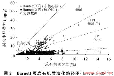 需要注意:初始有機(jī)質(zhì)豐度較高的烴源巖,隨著熱演化程度加深,生烴量增加,殘余有機(jī)碳豐度、氫指數(shù)、有機(jī)質(zhì)類型呈現(xiàn)降低、變差趨勢(shì),如Tmax(最大熱解溫度)432℃、等效成熟度0.62%,Barnett頁(yè)巖演化至Tmax為470℃,等效成熟度為1.3%時(shí),TOC數(shù)值可降低36%(圖2),對(duì)于高成熟和/或過成熟烴源巖,負(fù)面影響則更大,所以簡(jiǎn)單套用殘余有機(jī)碳豐度、氫指數(shù)或于酪根類型判斷頁(yè)巖生氣能力的高低可能有失偏頗。但儲(chǔ)集能力而言,殘余有機(jī)質(zhì)豐度常可表征含氣量大小,特別是當(dāng)兩者呈現(xiàn)正相關(guān)情況下。北美頁(yè)巖氣勘探目標(biāo)絕大多數(shù)選擇TOC含量大于2%,甚至4%以上,與此有關(guān)聯(lián)。因此資源潛力評(píng)價(jià)過程中應(yīng)綜合考量有機(jī)質(zhì)豐度指標(biāo),既要重視源巖原始有機(jī)質(zhì)豐度與生烴潛力,又要關(guān)注頁(yè)巖儲(chǔ)層殘余總有機(jī)碳含量的作用。