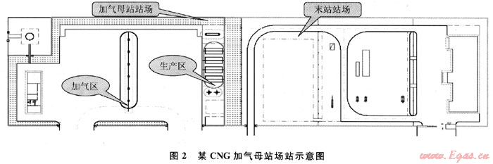 南京某CNG加氣母站設(shè)計規(guī)模為20×104m3/d,進站壓力為4.2~5.88MPa,溫度為17.2~22.5℃。該加氣母站分為生產(chǎn)區(qū)(壓縮機4臺,3用1備)、加氣區(qū)(6臺加氣柱)、站場值班室和停車區(qū)4個部分,如圖2所示。