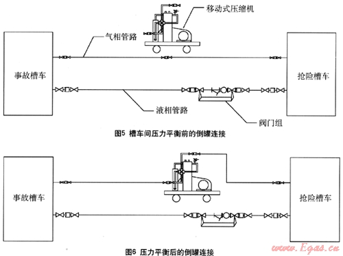 (3) 當(dāng)壓縮機(jī)上入口壓力降低到2.8bar(294Pa)以下時(shí)候關(guān)閉事故槽車氣相出口和搶險(xiǎn)槽車氣相出口,同時(shí)關(guān)閉柴油發(fā)動(dòng)機(jī)。關(guān)閉事故槽車的液相口,同時(shí)各管段上閥門關(guān)閉后拆卸,倒罐流程到此結(jié)束??筛鶕?jù)現(xiàn)場(chǎng)實(shí)際情況安排后續(xù)的氮?dú)庵脫Q和吊裝拖運(yùn)。