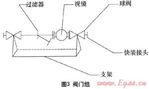 圖3所示閥門組主要是將一些液相管路上必須的設(shè)備集成在一個(gè)支架上以滿足進(jìn)行快速的安裝需要。主要包括過(guò)濾器、視鏡、球閥、快裝接頭和支架。視鏡主要是用于觀測(cè)液相管路中液相輸送情況,其內(nèi)部自帶止回閥,可防止搶險(xiǎn)槽車中的液相回流至事故槽車。