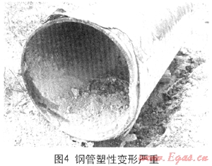 另外,施工單位應(yīng)有回拖時卡管情況下的應(yīng)急預(yù)案,龍大高速穿越卡管發(fā)生在第三塊孤石處,此時只需稍微后拉一下的擾動,再重新回拖時就可能錯過卡點。由于管道浮在泥漿中,這是不難做到的,而一味強拖則會越卡越緊。由于施工單位沒有合適的應(yīng)急預(yù)案,結(jié)果發(fā)生卡管時應(yīng)對失當(dāng),先是長時間停泵使泥漿干涸凝固,而后又在沒有鉆機有效引導(dǎo)情況下,用夯管錘暴力全程強夯,結(jié)果管段偏離管孔前行,導(dǎo)致鋼管塑性變形嚴重超標(圖4)。