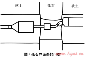 有人認為增加洗孔次數(shù)可避免卡管,實際上在堅硬孤石與松軟土壤交錯分布的情況下,由于松軟土壤被反復(fù)沖刷,使得孔徑遠大于堅硬孤石上的孔徑,從而在兩者交界處形成門檻。洗孔次數(shù)越多,門檻越明顯,管道回拖時發(fā)生卡管的風(fēng)險越大(圖3)。