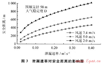 在給定風(fēng)速條件下,隨著泄漏速率增加,下風(fēng)向的安全距離也隨之增大(如圖3所示)。泄漏速率大小是影響穩(wěn)態(tài)重氣擴(kuò)散安全距離的決定因素。