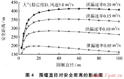 LNG儲罐周圍通常要設(shè)計(jì)圍堰,以防止儲罐發(fā)生泄漏時,液體四處流淌蔓延,若發(fā)生火災(zāi),還可以防止火焰蔓延到周邊地區(qū)[4]。LNG泄漏到圍堰內(nèi),會迅速蒸發(fā)氣化,形成以圍堰為二次源的蒸氣云團(tuán)擴(kuò)散。圖4給出下風(fēng)向安全距離隨著圍堰直徑和泄漏速率的變化。當(dāng)圍堰尺寸較小時,以圍堰為二次源云團(tuán)的范圍也較小,有限的蒸發(fā)氣受大氣湍流影響,其濃度較快稀釋,安全距離較?。划?dāng)圍堰尺寸過于增大時,二次源云團(tuán)的天然氣濃度較低,其下風(fēng)向擴(kuò)散距離不再增加,反而略有減少。