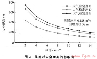 所建立的LNG泄漏氣體擴(kuò)散模型計(jì)算方法,經(jīng)過實(shí)驗(yàn)驗(yàn)證,其平均偏差為24.28%,并較準(zhǔn)確地體現(xiàn)了重氣擴(kuò)散過程中云團(tuán)內(nèi)部特性的變化規(guī)律。對于穩(wěn)態(tài)LNG氣體擴(kuò)散,當(dāng)風(fēng)速大于2m/s時,隨著風(fēng)速的增加,安全距離是逐漸減小的;對于較小風(fēng)速(小于2m/s)時,該穩(wěn)態(tài)模型將不再適用。泄漏速率增大使安全距離幾乎成比例增大,是影響安全距離最重要因素之一。對于給定的LNG泄漏率,圍堰尺寸變化對安全距離的影響會呈現(xiàn)出一個弱峰,之后安全距離會隨圍堰尺寸的增加而略有減小。
