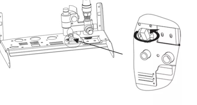 3、逆時(shí)針旋轉(zhuǎn)注水/補(bǔ)水閥一周(如下圖),并觀察壁掛爐面板水壓表的指針位置,水會(huì)從采暖系統(tǒng)經(jīng)過(guò)補(bǔ)水閥通道倒流到熱水出口,如果水壓表指針回到1.5bar以下時(shí),順時(shí)針旋轉(zhuǎn)關(guān)閉注水/補(bǔ)水閥。