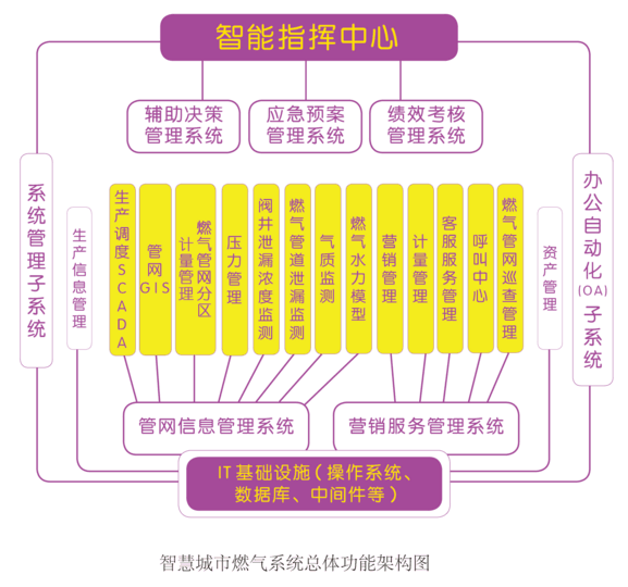 智慧城市燃?xì)庀到y(tǒng)主要由十大應(yīng)用系統(tǒng)共21個(gè)子系統(tǒng)組成,即生產(chǎn)領(lǐng)域的管網(wǎng)信息管理系統(tǒng);服務(wù)領(lǐng)域的營(yíng)銷服務(wù)管理系統(tǒng);領(lǐng)導(dǎo)決策支持的應(yīng)急預(yù)案管理系統(tǒng)、輔助決策管理系統(tǒng)、績(jī)效考核管理系統(tǒng);統(tǒng)一指揮調(diào)度的智能指揮中心系統(tǒng);自動(dòng)化辦公的OA系統(tǒng)和系統(tǒng)管理支撐子系統(tǒng)。