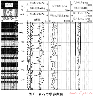 地層的孔隙壓力、體積模量、楊式模量、單軸抗壓強度、最小水平主應(yīng)力方向等參數(shù)是出砂預(yù)測的重要參數(shù)。這些參數(shù)均可在實驗室和氣井生產(chǎn)過程得到,但得出的數(shù)據(jù)是離散的且成本較高。目前已經(jīng)有成熟的利用測井方法求散巖石力學(xué)參數(shù)的方法[1],筆者采用Schlumberger公司的STARS軟件,以縱波時差、橫波時差、補償密度、泥質(zhì)含量和地層孔隙度為輸入曲線,求取巖石的彈性模量和巖石強度。圖1為計算得到的地層的巖石力學(xué)參數(shù),這些參數(shù)將用于出砂預(yù)測。