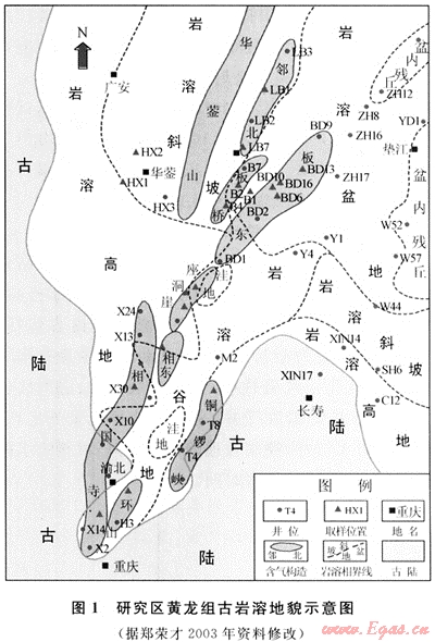 碳酸鹽礦物鍶同位素地球化學(xué)特征是碳酸鹽巖成因分析最重要的證據(jù)之一[1~2],近年來國外將鍶同位素地球化學(xué)特征廣泛地應(yīng)用于碳酸鹽巖石學(xué)、巖相古地理和儲層地質(zhì)學(xué)等研究領(lǐng)域中,而將其應(yīng)用到碳酸鹽巖古巖溶儲層中的成果則很少[3~4]。筆者僅就渝北-鄰水地區(qū)上石炭統(tǒng)黃龍組古巖溶儲層的鍶同位素特征對巖溶過程的流體性質(zhì)和古水文條件展開討論,為預(yù)測和評價此類儲層提供有關(guān)的地質(zhì)-地球化學(xué)信息。